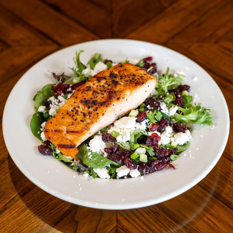 Spring mix, dried cranberries, scallions, and feta cheese topped with a 5 oz piece of salmon.
